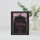 Jet Black com acentos de folha de rosa dourada falsos e escrita com letra de mão. Rosas Florais Cor-de-Rosa Dourada Script Elegante Convite De Casamento. Personalize com o texto do seu casamento.