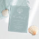Este simples design de convite para casamento de praia de vidro marinho tem uma casca de couro cabeludo no topo, uma elegante caligrafia, e um quadro ao redor da borda.