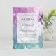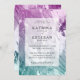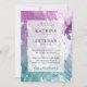 Convite de casamento moderno e na moda com um fundo de tinta acrílica de cor lacrimogênea e roxa. Os textos têm um aspecto simples e minimalista. Na moda design para o primavera ou casamento de verão.