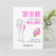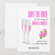 Um design feminino e lindo combina um fundo branco elegante com uma tipografia moderna incrível e flores cor-de-rosa, bem como taças de champanhe. O cartão Salve a Data para o seu casamento é importante e você merece o melhor. Este design elegante e luxuoso será perfeito.