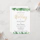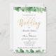 Um convite de casamento com eucalipto verde e dourado com caligrafia dourada.