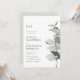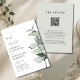 Elegante Russo Eucalyptus Código QR Sage Monograma Convite Casado. Nosso simples verde botânico, tudo em um convite de casamento, apresenta um galho elegante de eucalipto com aquarela em tons de sábio e verde empoeirado no texto do convite ao seu lado. A parte de trás do convite também exibe o código QR do seu site de casamento, assim como o próprio URL do site, permitindo que seus convidados facilmente RSVP on-line e visualizem todos os detalhes normalmente enviados em um pacote de casamento. O código QR atualizado neste convite permite gerar o seu próprio código QR do site de casamento simplesmente digitando o URL do seu site na modelo de personalização onde indicado. Todo texto de exemplo pode ser facilmente revisado com suas próprias informações sobre o modelo de personalização.