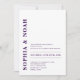 Este convite apresenta um fundo branco sofisticado com um design minimalista. Os nomes do casal são destacados em tipografia ousada e elegante em roxo, acrescentando um toque de elegância moderna ao convite.