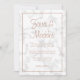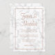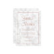 Convites de casamento modernos e elegantes com seus nomes em um grande roteiro no topo e seus detalhes de casamento em um falho rosa, dentro de uma fronteira, sobre uma cinza e fundo de mármore branco. Este design e chic é excelente para uma celebração no inverno.