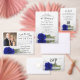 Este convite para o casamento é elegante, exuberante e romântico. Apresenta uma bela fotografia de um solteiro royal, de cor azul, vívida e longo rosa, que se encontra ao seu lado, refletindo em água com ondas e ondulações. A parte de trás é uma cor de cobalto marmoreada. Uma bela maneira de convidar seus amigos e família para compartilhar em seu dia especial.