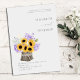 Um pote de flor, feito de latido de árvore e cheio de um buquê exuberante de híbridos, girassóis, lavandas, trigo e hálito de bebê, faz uma ilustração adorável, pintada à mão em aquarela digital, que decora este convite de casamento elegante e rústico. Romântico e charmoso, é uma escolha encantadora para um casamento de celeiro, um casamento ao ar livre, um casamento de jardim ou qualquer lugar rústico.