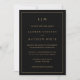Simples convite de casamento com um design moderno, mas elegante, com seu monograma de duas letras no topo e seus detalhes cercados por uma fina fronteira. Todo o texto está em ouro sobre fundo preto. As fontes e as cores de fundo podem ser alteradas para qualquer cor desejada clicando no botão "personalizar". Um design chic e na moda que é excelente para um casal minimalista.