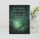 Uma ilustração com aquarela esbranquiçada da folhagem esmagadora em verde esmeralda, cintilante com delicadas luzes de fadas e poeira mágica, decora este convite de casamento outono de verão com um tema de floresta encantado. Um convite elegante e moderno para um casamento de conto de fadas. Perfeito para noivas que amam o cenário de conto de fadas, a floresta de fadas ou o tema do jardim de fadas e o verde esmeralda.
