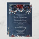 Este convite vem com um envelope branco. Envelope burgundy de marinho correspondente, RSVP e outros artigos de papelaria são comprados separadamente. Um convite de casamento de marinho arrojado com uma floral pintada a aquarela de peões azuis e burlões marinhos em cascata entre o verde azul empoeirado de eucalipto em um fundo de aquarela de marinho com um conjunto de caligrafia branco de fonte inchada anunciando seus detalhes de casamento.