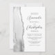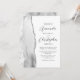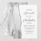 A borda esquerda deste convite de casamento moderno e elegante apresenta uma borda de ágata em tons de cinza e branco com brilho de prata falsa. O texto personalizável combina fontes script e sem serifa em cinza carvão sobre um fundo branco. O verso apresenta um design de ágata cinza e prata correspondente.
