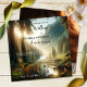Um convite de casamento sonhador que apresenta uma cena de montanha ensolarada e nebulosa com árvores e flores. Este convite tem placas RSVP correspondentes. Bonita para um primavera ou casamento outono.