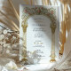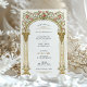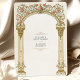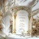 Este elegante convite de casamento vitoriano apresenta um grande arco de ouro enfeitado com a subida de videiras de rosas cor-de-rosa e delicado verde. Os intrincados detalhes florais e a coluna clássica de sofisticação e encanto romântico do eterno exude. Perfeito para casais que procuram artigos de casamentos inspirados em vintage com uma estética luxuosa e um toque de elegância floral.