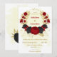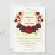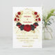 Flores românticas, vermelhas escuras e negras, com folhas de ouro, convite de casamento botânico Os detalhes da brilha são simulados. É adequado para casamento e festas de noivado.