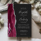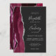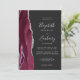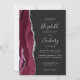 A borda esquerda deste elegante convite de casamento moderno apresenta uma cor d'água borrifada com borda cortada com cintilação falsa de prata. O texto personalizável combina a escrita manual de cinzas prateadas, fontes copperplate e itálico em um fundo fora do preto. O lado inverso apresenta um design de burgundy e agate prateado.