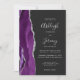 A borda esquerda deste elegante convite de casamento moderno apresenta uma cor d'água roxa, borda agitada com falso brilho prateado. O texto personalizável combina a escrita manual de cinzas prateadas pálidas, fontes copperplate e itálico em um fundo negro e escuro. O verso apresenta um design de agata prateado e roxo correspondente.