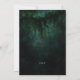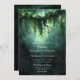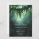 Uma ilustração com uma aquarela esbranquiçada de um galho grosso de árvores florestais com folhagem esmagadora e videiras em verde esmeralda, cintilante com luzes de fadas e poeira mágica, decora este convite de casamento outono de verão com um tema de floresta encantada. Um convite elegante e moderno para um casamento de conto de fadas. Perfeito para noivas que amam o cenário da floresta de conto de fadas, o tema da floresta de fadas ou do jardim de fadas, o tema da floresta moderna e o verde esmeralda.