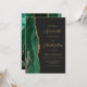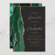 A borda esquerda deste elegante convite de casamento moderno apresenta uma esmeralda verde aquarela agate borda com falsa brilho dourado. O texto personalizável combina o script dourado e as fontes sans serif em um fundo preto de slate. O verso apresenta um design emerald verde e dourado.