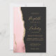 A borda esquerda deste elegante convite de casamento moderno apresenta uma cor-de-água rosa pincelada com borda falsa de ouro. O texto personalizável combina manuscrito dourado, fontes em copperplate e itálico em um fundo fora de preto. O verso apresenta um design dourado e uma pincelada correspondente.