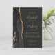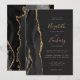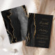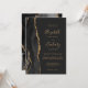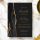 A borda esquerda deste convite de casamento moderno e elegante apresenta uma borda de ágata em aquarela preta aparada com brilho de ouro falso. O texto personalizável combina caligrafia dourada, copperplate e fontes itálicas em um fundo preto claro. O verso apresenta um design de ágata preto e dourado correspondente.