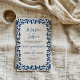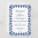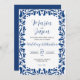 Este design de Convite para Casamento de Boda Clássico Floral Azul Mexicano apresenta um fundo branco limpo, enquadrado com elegantes, pintados à mão, filmes azuis florais e foliados. A fronteira é composta por formas de lágrimas e videiras giratórias, pontuadas por pequenos sotaques florais, criando uma composição graciosa e simétrica. O uso de uma matiz índia profunda dá ao layout uma estética clássica e refinada, ideal para ocasiões formais como casamentos ou eventos de marco.