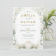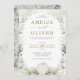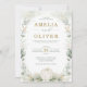 Este elegante convite de casamento de temas botânicos apresenta lindas folhas de verde-aquarela em verde-sábio e ouro, uma adorável abóbora alabastro e uma tipografia elegante que combina um texto moderno e limpo e um toque de caligrafia