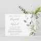 Convite elegante de casamento com aquarelas de verde-sábio eucalipto verde-verde-verde, folhas de louros e sotaques de ouro, tipografia moderna de cinza mole e seus nomes em um roteiro de ouro-na moda.
