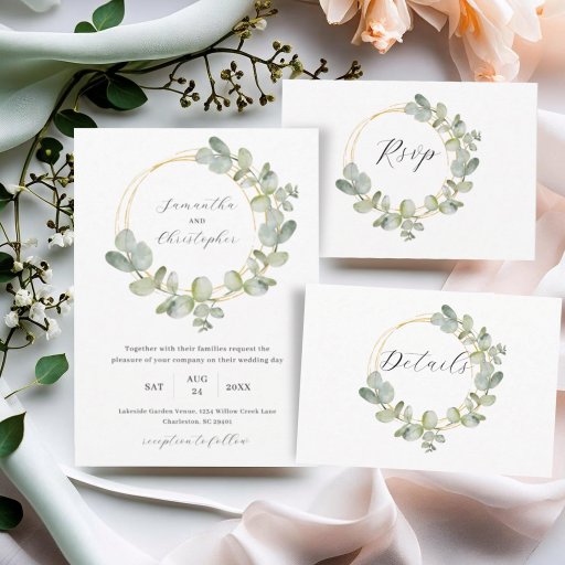 Convites Casamento Eucalyptus Verde e Dourado Watercolor Wr
