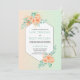 Este encantador convite apresenta um pano de fundo gradiente de pêssego e verde-menta claro. Um fundo branco permite que o texto do seu convite se destaque. Os rosas de pêssego bonito e as folhas moles de eucalipto enquadram as palavras. Perfeito para primavera ou casamentos de verão.