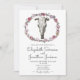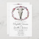 Convite de casamento russo estilo boho chic com um crânio de vaca do estilo sudoeste e uma coroa floral de rosas com um fundo texturizado e uma fonte escrita à mão.