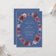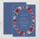 Um romantico oval de flores pintadas em azul e borgonha adorna este design. O arranjo floral rico evoca um sentido de charme clássico e romance sofisticado. Este design é perfeito para uma ocasião atemporal e elegante.