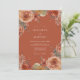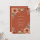 Este design apresenta um rico fundo laranja queimado adornado com flores pintadas em tons de coral e pêssego. Flores e folhagens delicadas criam uma atmosfera quente e romântica, perfeita para uma celebração outonal ou boêmia. A obra de arte evoca um senso de elegância rústica.