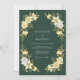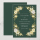 Um rico fundo verde floresta é adornado com delicados arranjos de flores amarelas cremosas e brancas suaves. Folhas e folhagens douradas se entrelaçam, criando uma atmosfera elegante e romântica perfeita para uma ocasião especial. Este design evoca um sentimento sofisticado e inspirado na natureza.