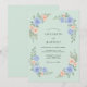 Este design apresenta um cenário sereno em verde menta decorado com delicados arranjos florais em aquarela. Rosas azuis pervinca elegantes e flores de pêssego suaves são combinadas com folhagem verde exuberante para criar uma estética fresca e arejada. Esta paleta e estilo são ideais para uma cerimônia temática da natureza sazonal.