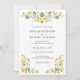 Convites de casamento artísticos com flores amarelas, laranja e lacrimogêneas, vinhas e folhas no topo e nos dois cantos inferiores, sobre fundo branco. Seus detalhes estão no meio, num sans serif. A parte de trás é verde e pode ser alterada para qualquer cor que você desejar. Esta design é excelente para um casamento no jardim no verão.