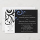 Convites negros modernos e marcantes para casamento, contemporâneos, com sotaques azuis de girassol branco e rosado, com delicado fundo de folha de rolagem de espiral. Personalize online com seus detalhes de casamento.