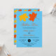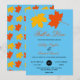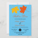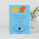 Este elegante convite de casamento outono é perfeito para um casamento moderno no outono. A simples design apresenta folhas laranja e amarela com elegante tipografia negra e laranja sobre fundo azul-céu