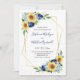 Estes convites para o casamento apresentam um design floral de aquarela com girassóis, hydrangea e rosas azuis marinhos com uma falso estrutura geométrica dourada. Personalize o texto do convite com o seu próprio texto.