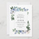 Um design floral com flores azuis e brancas adoráveis com folhagem verde. A cor e o texto podem ser editados para corresponder ao tema do casamento. você pode alterar o tamanho do texto, a fonte e o posicionamento.
