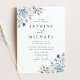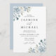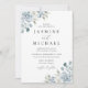 Convites de casamento florais elegantes com detalhes de seu casamento com buquês de rosas azuis e brancas poeirentas, hidrangeas, folhas de eucalipto exuberantes e verde. Este convite de casamento floral azul empoeirado é perfeito para o seu primavera ou casamento de verão!