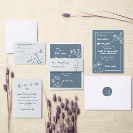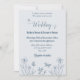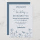 Convite de casamento simples único com flores azuis românticas e elegantes e poeirentas em fundo azul claro PARA MAIS PRODUTOS CORRESPONDENTES clique na coleção acima ou entre em contato comigo.