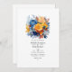 Convite de casamento floral azul, laranja e amarelo. Ideal para qualquer tema ou casamento de jardim. O código QR no verso direciona para o seu local de casamento onde o pessoas pode aprender mais e rsvp