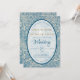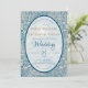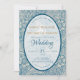 O texto é escrito em uma oval transparente branca, com letras azuis, exceto os nomes, que são dourados. A palavra Casamento é escrita em uma fonte caligráfica; o resto está em maiúsculas.