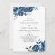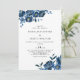 Este convite de casamento floral azul moderno é perfeito para um casamento no inverno. Este elegante design floral pintado à mão apresenta flores azuis, azuis escuras e indigo graciosas com folhas verdes, representando majestosa beleza natural.