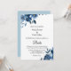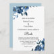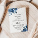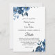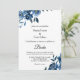 Este convite de casamento floral azul moderno é perfeito para um casamento no inverno. Este elegante design floral pintado à mão apresenta flores azuis, azuis escuras e indigo graciosas com folhas verdes, representando majestosa beleza natural.