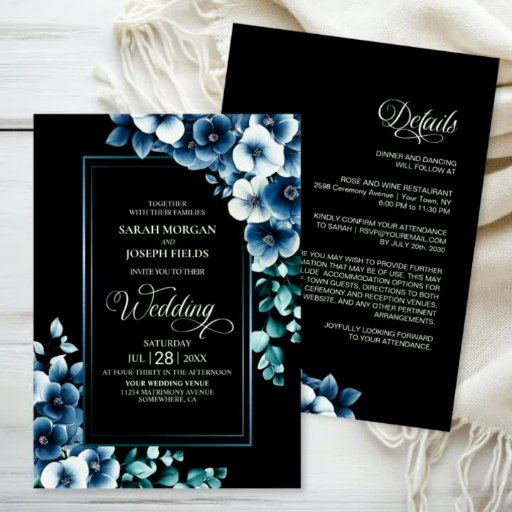Convide seus amigos e entes queridos para comemorar sua união com este floral azul moderno, tudo em um convite de casamento. O texto personalizável permite adicionar sem esforço os nomes da noiva e do noivo, a data do casamento e os detalhes necessários de sua celebração. Projetado para o casal econômico, a localização do local de recepção, a solicitação de resposta RSVP, os detalhes de acomodação e qualquer outra informação que seus convidados possam exigir podem ser incluídos no verso deste convite, economizando dinheiro em papelaria extra. Uma variedade de tipos de papel e estilos de canto estão disponíveis para seus convites exclusivos, juntamente com a opção de download se você preferir um formato digital.
