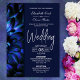 Um elegante convite para o casamento floral azul desenhado para se adequar a casais que planejam trocar votos em um local e celebrar com janto, dança, brindes com amigos e entes queridos em outro.