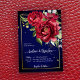 Peonias bicudas modelo de convite para casamento azul real floral com o código QR RSVP detalhes no verso.