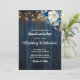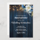 Um belo Convite de Casamento com caligrafia elegante, completado por maravilhosas madeiras azuis, luzes de cordas de jardim e floral azul branco com brilho dourado. Você pode personalizar este cartão com seus detalhes de casamento.