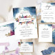 Convite de casamento único com manchas impermeáveis de cor d'água criando um quadro celeste que inclui seus detalhes de casamento e belo floral boêmico no centro em uma graciosa mistura de tons azuis, marinhos, turquesas, roxo, fúcsia, mostarda e matizes ouros. Palavra com os nomes dos pais da noiva ou do noivo no topo, que pode ser mudada para "o prazer da sua empresa é solicitado". O mesmo convite com "noiva e noivos nomes de pais" no texto mais alto, assim como com "junto com seus pais"/"com alegria de excelente" também está disponível. Detalhes da caligrafia escrita à mão. Voltar com manchas de aquarela atrativas, detalhes florais de canto e seção com iniciais de casal. Parte da nossa coleção "Mystic Garden Celestial" com uma variedade de produtos de coordenação disponíveis.