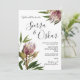Elegante Dusty Pink Protea & Eucalyptus Invitation. Ponha o tom para o seu dia especial com este maravilhoso convite para o casamento, com uma proteína rosa empoeirada pintada à mão, verde macio e sofisticados sotaques de eucalipto. A tipografia do guião que flui adiciona um toque romântico e sofisticado, fazer perfeito para casamentos boho, rústicos ou inspirados na natureza. Projetado cuidadosamente para a elegância do eterno, este convite é totalmente personalizável para refletir a sua história de amor única. Impresso em materiais de alta qualidade, é um belo guardião para merecer muito depois da celebração.